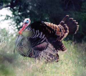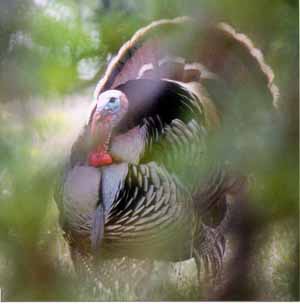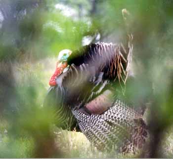 This love sick Rio Grande gobbler came in to the call and decoys. He was no more than 15 feet behind me through some bushes in the upper left and lower photo. He stuck around for at least 30 minutes trying to get a response out of the decoys by strutting, drumming and gobbling. |